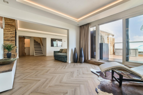 The spacious and bright living room offers plenty of space for both a comfortable seating area and a dining area. Adjacent is the open kitchen, equipped with a modern kitchen unit featuring an Emperador Dark marble countertop, induction hob, extractor hood, and Siemens built-in appliances, including a steam oven, dishwasher, and fridge/freezer combination. Large windows allow for pleasant natural light and a spacious feel.